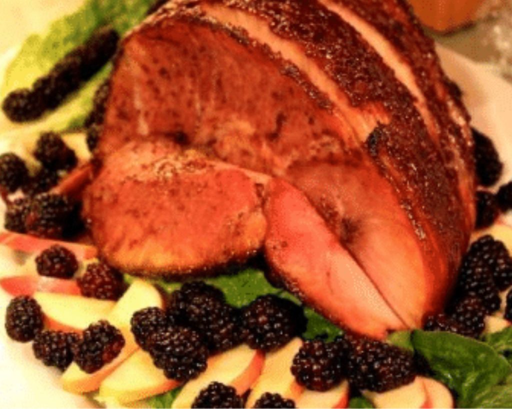 Bake Ham according to instructions or until a thermometer registers 140 degrees F (approx. 15-20 minutes per pound) basting with half of the pre serves mixture every 20 minutes. Remove ham to a serving dish and let rest for 15 minutes before slicing.
