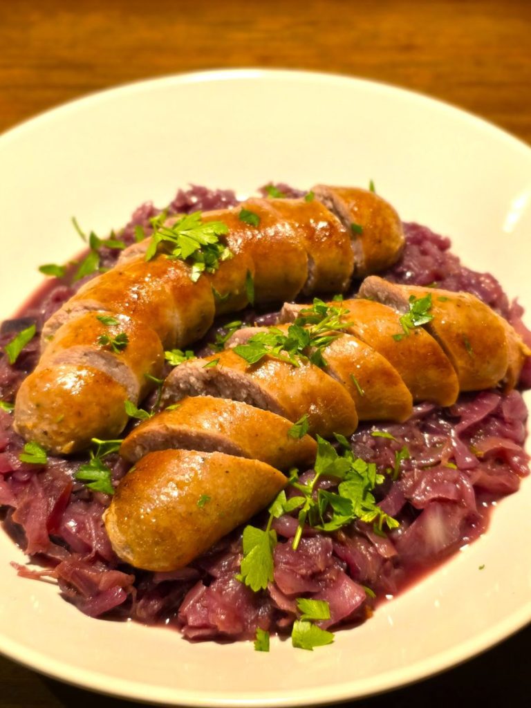 A super easy weeknight meal cooked in minutes that will make you feel warm and cozy all night! Serve it in classic German style with spaetzle, potatoes, or a hoagie roll and a side of whole grain mustard.
