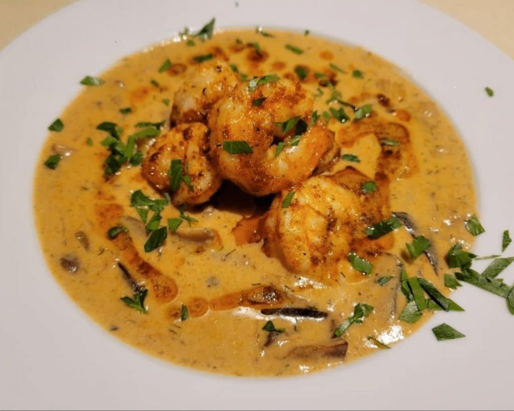 While the shrimp is cooking on the second side serve the soup into bowls. Place the cooked shrimp in a pile in the center of the soup and drizzle the butter and oil mixture around the soup and garnish with parsley. Enjoy!