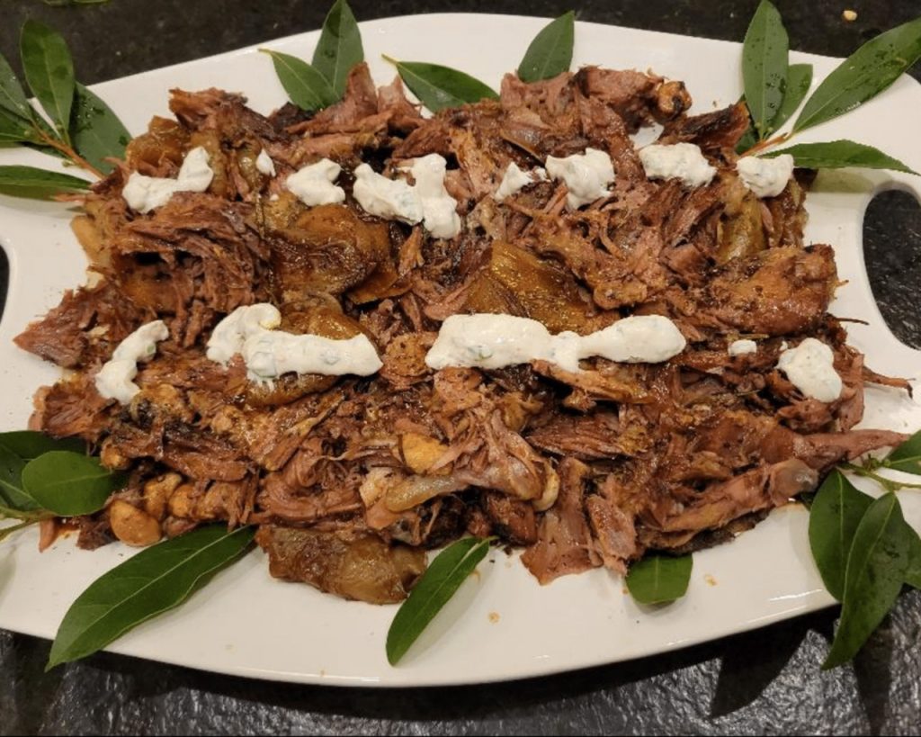 Once the lamb is roasted, shred the meat removing all of the bones and place on a serving platter or individual plates. Pour the pan drippings into a Fat/Gravy Separator to allow the fat to rise to the top leaving the rich jus at the bottom. Pour the jus over the shredded lamb, dollop some Goddess Sauce on the meat and garnish with fresh Dill or Parsley.